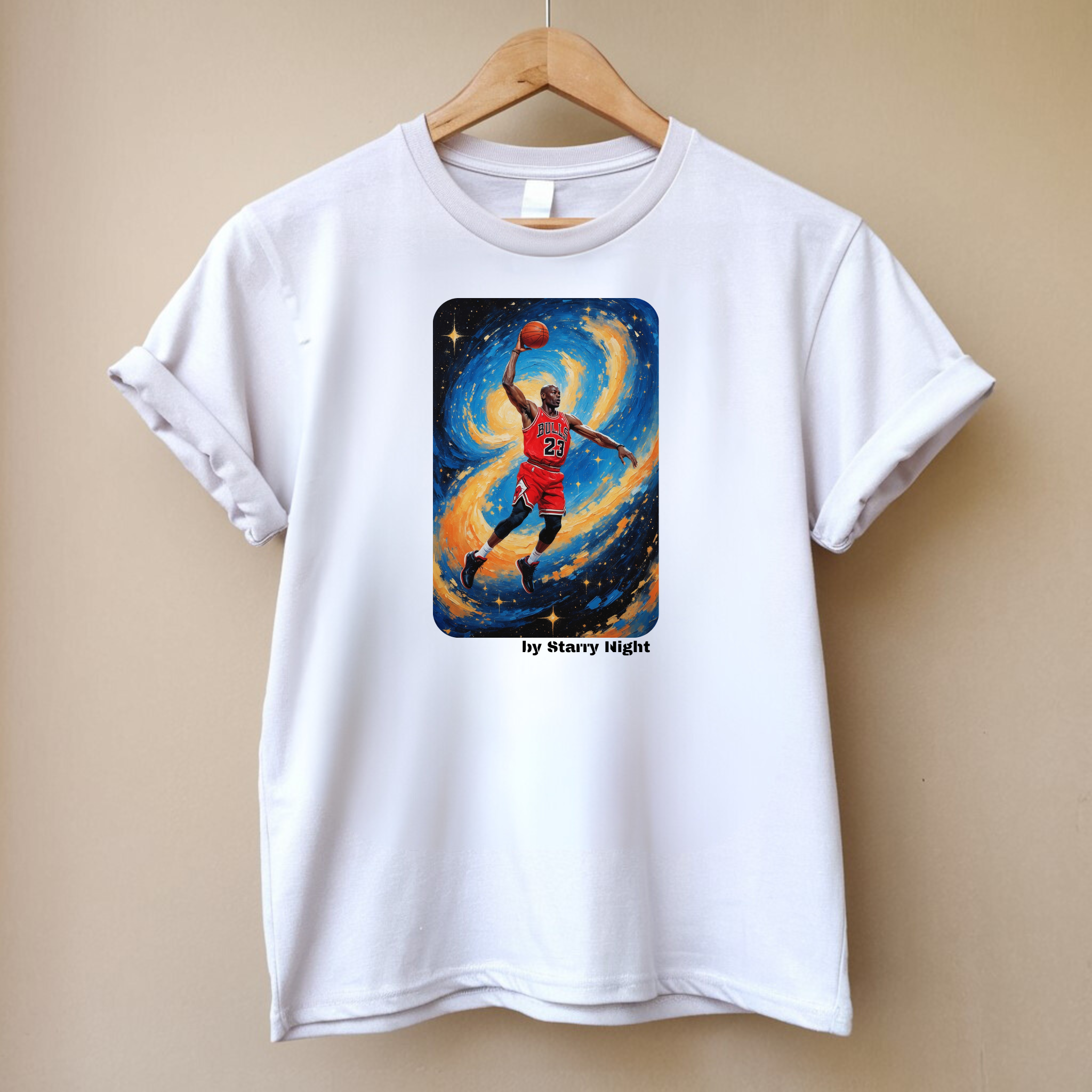Koszulka męska w kolorze białym z nadrukiem inspirowanym słynnym obrazem „Gwiaździsta noc” Vincenta Van Gogha i wizerunkiem Michaela Jordana.