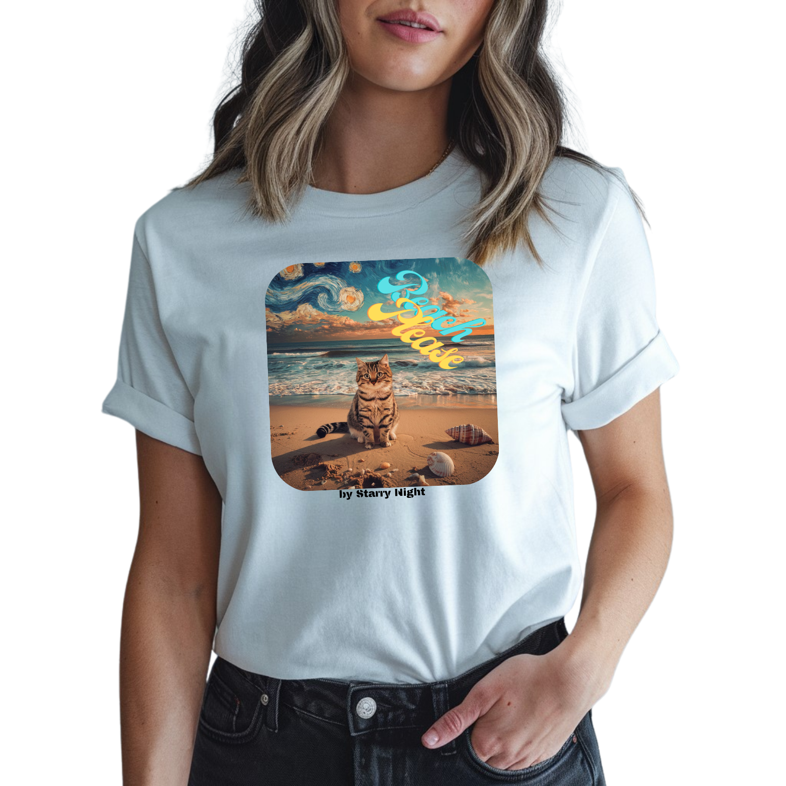 Koszulka damska w kolorze białym z nadrukiem inspirowanym słynnym obrazem „Gwiaździsta noc” Vincenta Van Gogha, wizerunkiem kota na plaży i hasłem „Beach, please”.