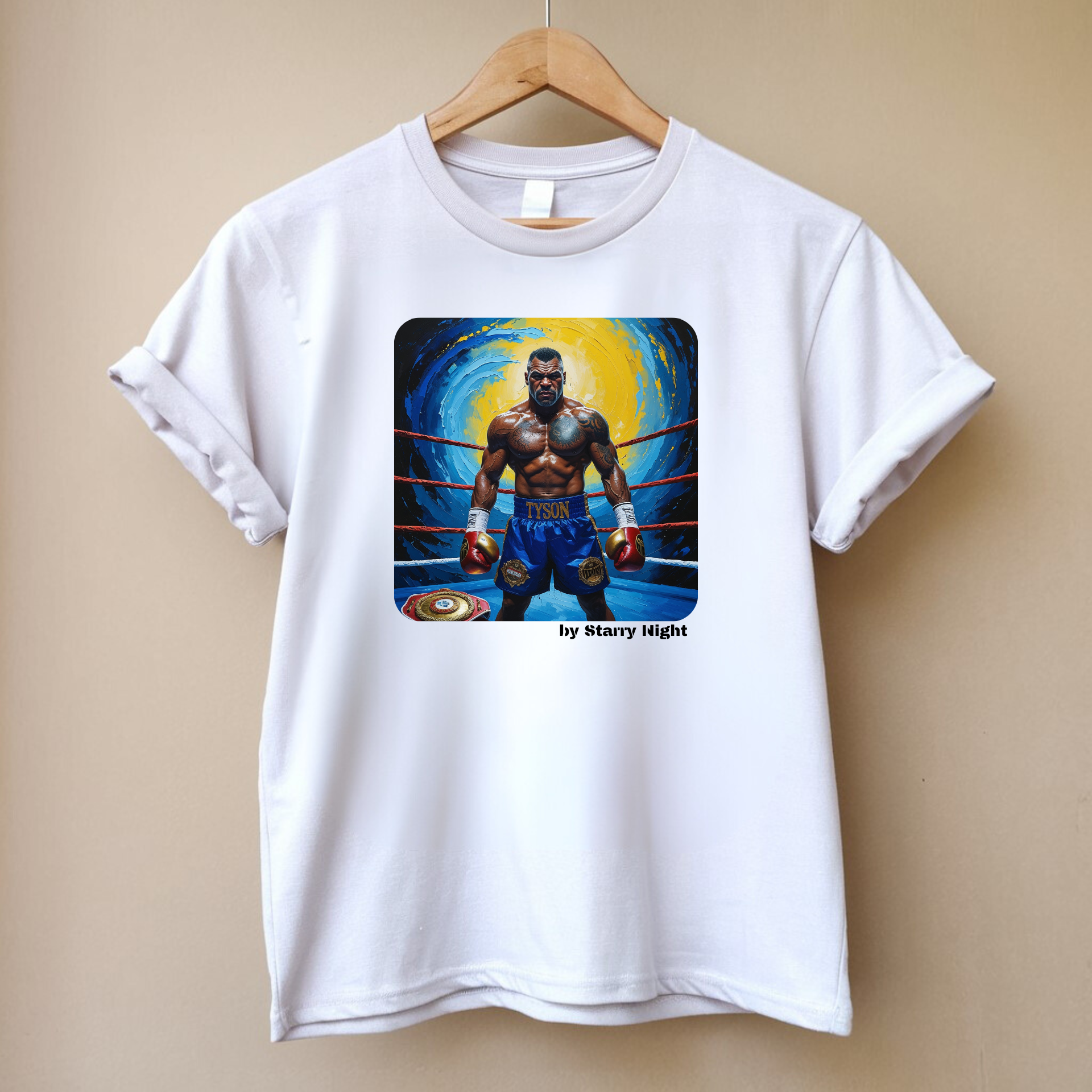 Koszulka męska w kolorze białym z nadrukiem inspirowanym słynnym obrazem „Gwiaździsta noc” Vincenta Van Gogha i wizerunkiem Mike’a Tysona.