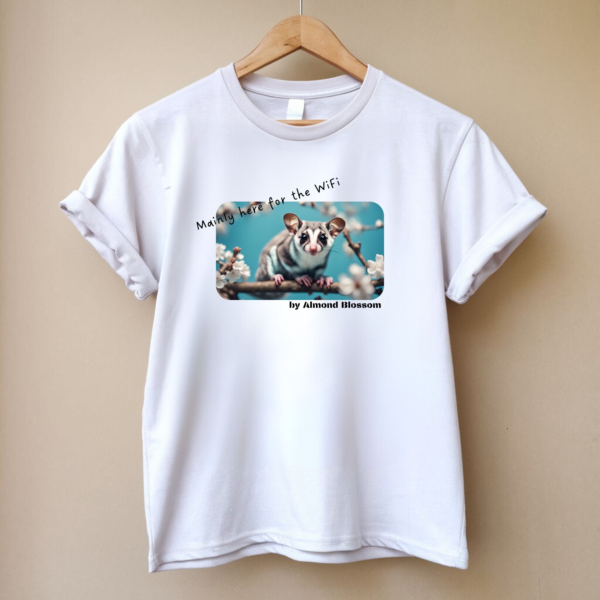Koszulka męska w kolorze białym z nadrukiem inspirowanym słynnym obrazem „Kwitnący migdałowiec” Van Gogha, wizerunkiem zwierzątka sugar glider oraz hasłem „Mainly here for the wi-fi”. Grafika umieszczona jest na froncie i przyciąga uwagę wyrazistymi, kontrastowymi barwami. Intensywne odcienie błękitu i białego nadają całości artystycznego, nieco malarskiego charakteru.