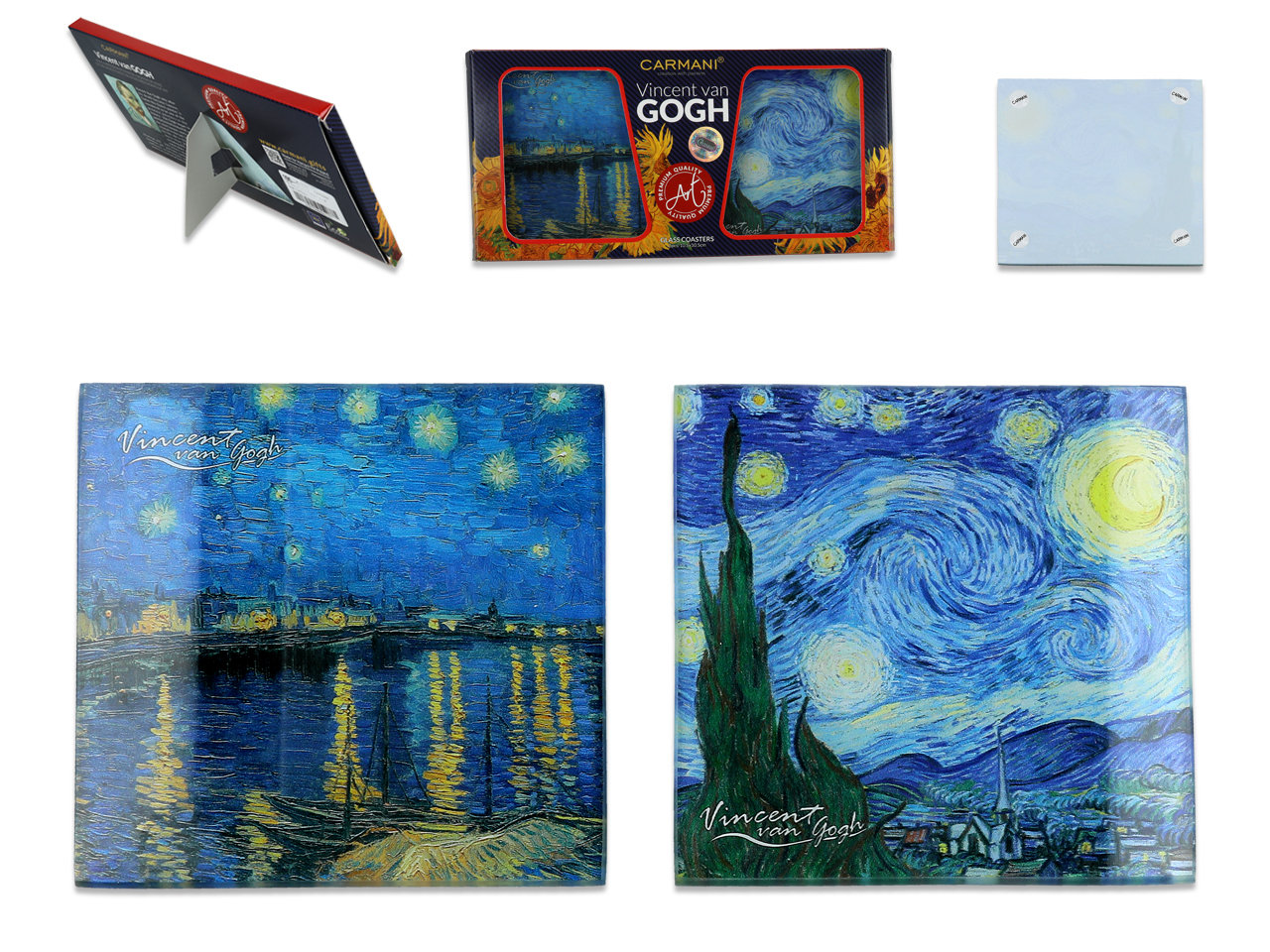 Zestaw 2 kwadratowych podkładek pod kubek z motywem malarstwa. Wykonane ze szkła, przez co bardzo łatwo je umyć. Zabezpieczone silikowonowymi nóżkami. Unikalne wzory i staranne wykonanie sprawi, że podkładki podkreślą wystrój każdego wnętrza.